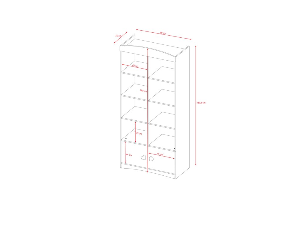 Knihovna obsahuje 8 otevřených polic o rozměrech 42 x 29 x 33,5 cm a 1 uzavřenou polici o rozměrech 86,4 x 40,4 x 33,6 cm. Pro zajištění bezpečnosti je knihovna vybavena speciálními úhelníky pro uchycení na zeď, které zvyšují její stabilitu.