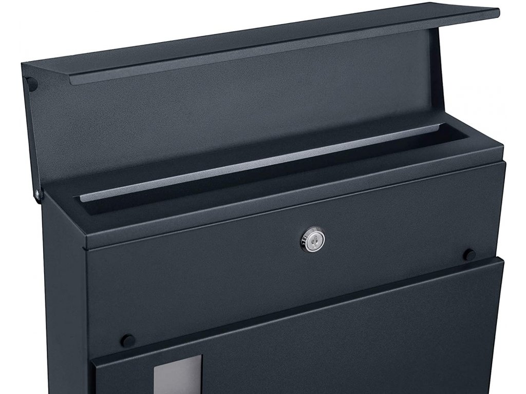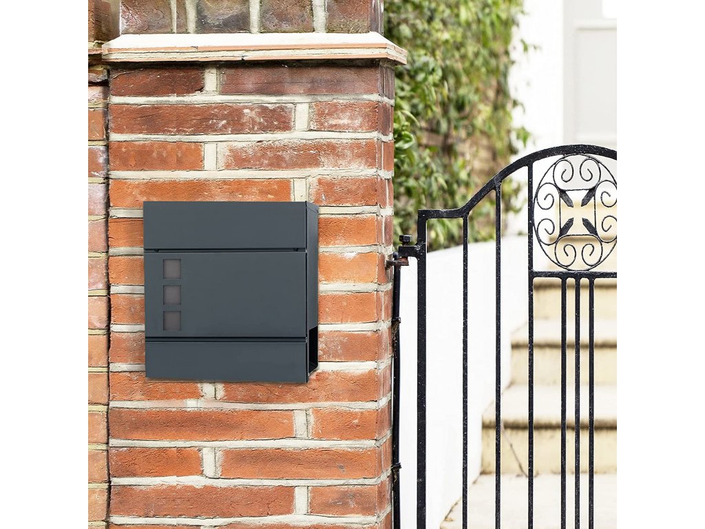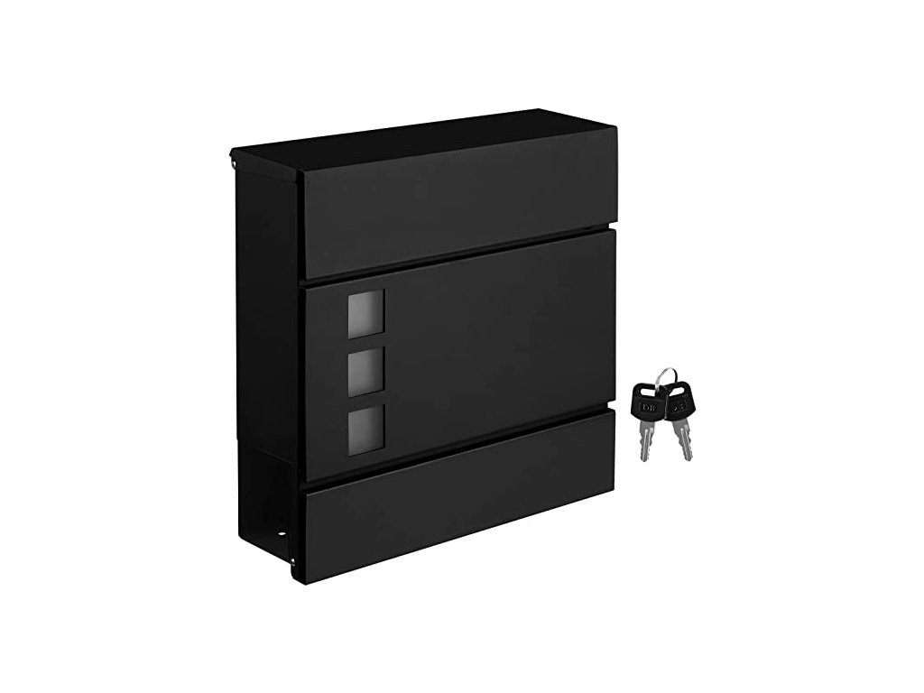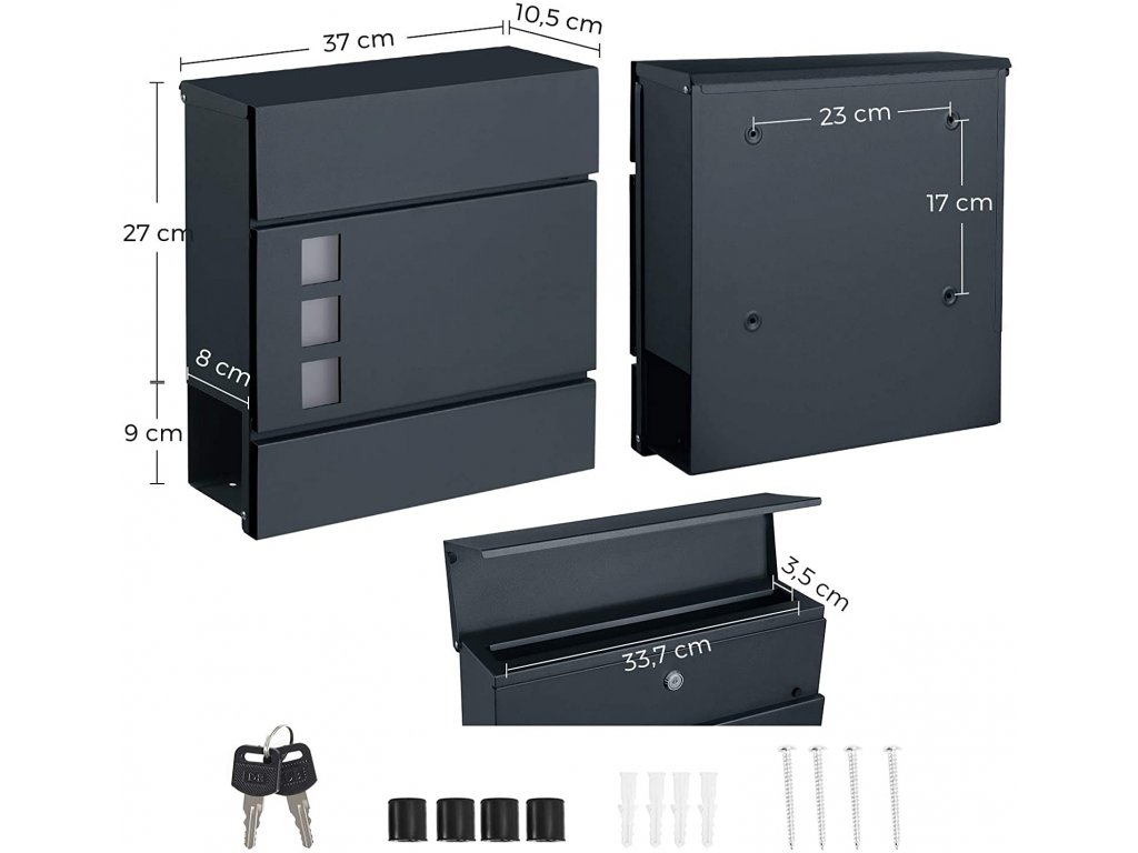 robustní poštovní schránku na stěnu s odklápěcím víkem, zámkem, dvěma klíči, průzory, montážním kováním a elegantním vzhledem, který dodá vašim venkovním dveřím šarm a novost.