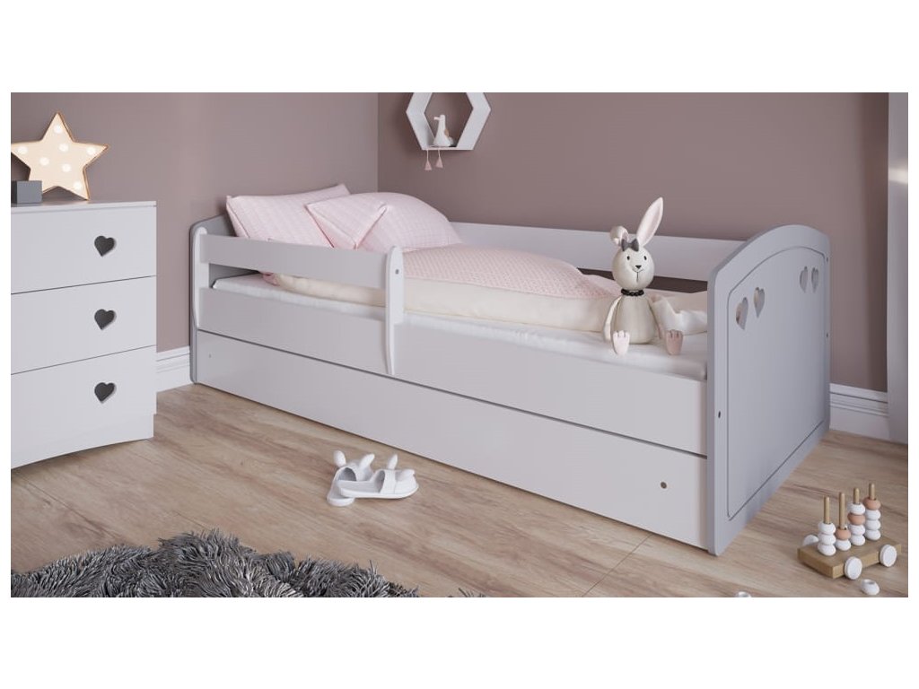 Jednolůžko se zábranou je vyrobeno z vysoce kvalitní laminované dřevotřísky o tloušťce 18 mm. Čela postele jsou vyrobena z MDF desky dvakrát lakované ekologickými a certifikovanými barvami. Je k dispozici v několika rozměrech. Nábytek je vybaven dekorativními výřezy ve tvaru srdce, které slouží jako úchytky.