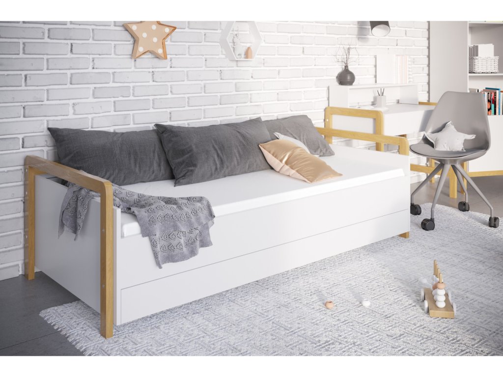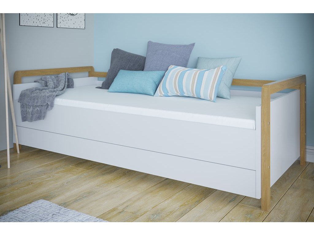 Základním materiálem tvořícím pohovku je certifikovaná laminovaná nábytková deska o tloušťce 18 mm s bílou povrchovou úpravou. Pro větší bezpečnost a jistotu jsou kolem nábytku použity dubové lakované zábrany. Rozkládací pohovka Victor má prostornou zásuvku, což vám dává možnost využít nábytek jako úložný prostor pro vaše každodenní věci.