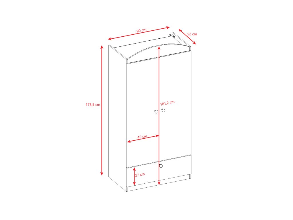 Šatní skříň je dvoudveřová, rozdělená na 2 části. Jedna polovina obsahuje tyč na oblečení a druhá má 4 police o šířce 40,2 cm a maximální nosnosti 5 kg. Ve spodní části skříně se nachází 1 prostorná zásuvka o šířce 80,3 cm a hloubce 43,2 cm.