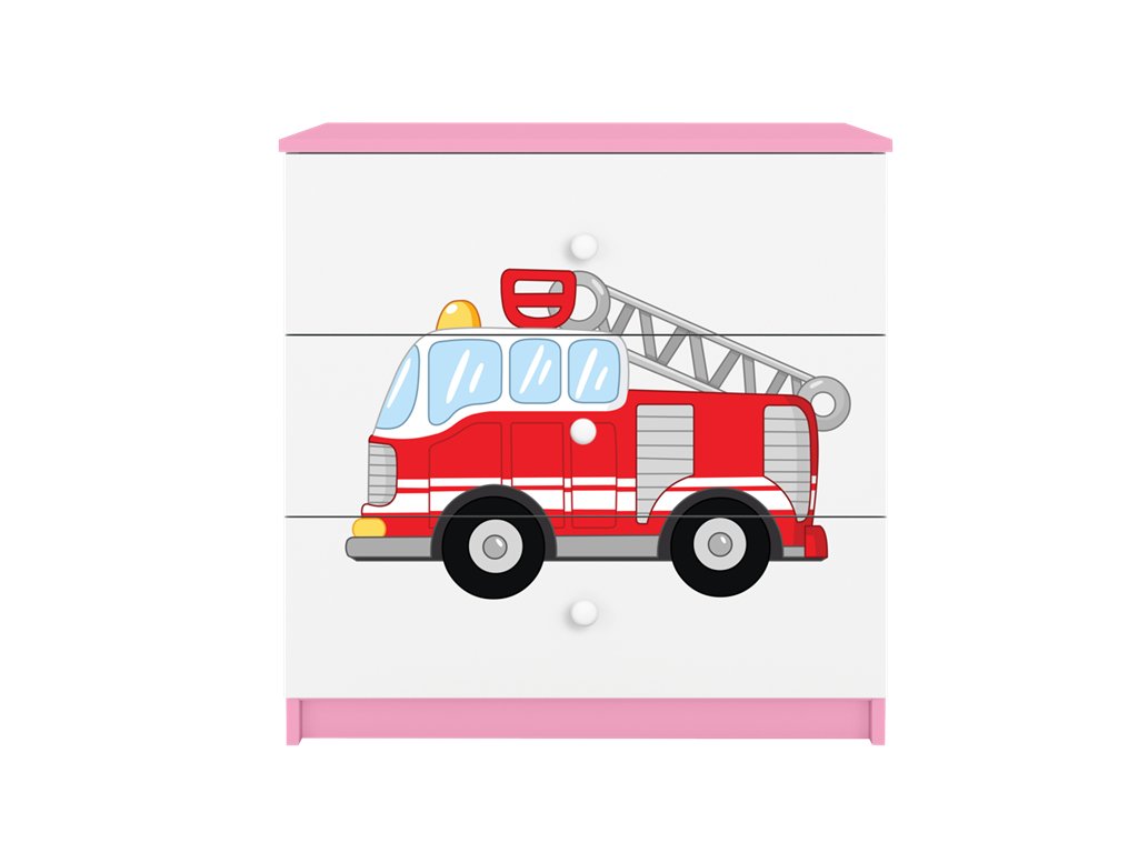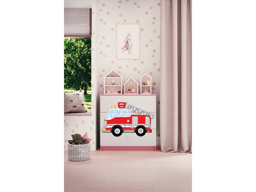 Komoda obsahuje 3 prostorné zásuvky o šířce 69,4 cm a hloubce 33 cm, které jsou uloženy na kuličkových pojezdech. Pro doplnění vzhledu pokrývá přední stranu komody barevný samolepicí obrázek.