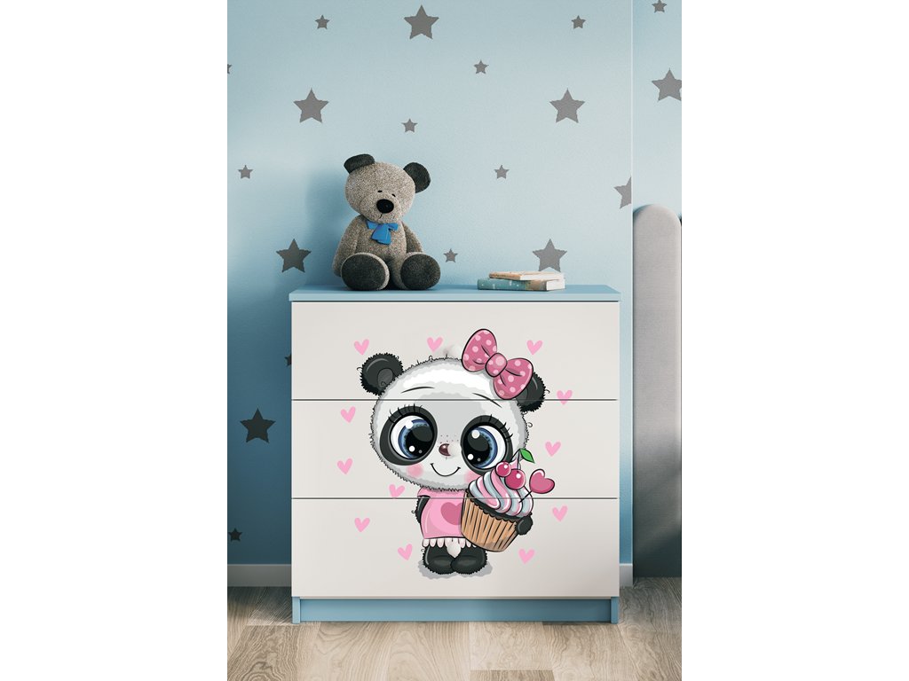 Komoda obsahuje 3 prostorné zásuvky o šířce 69,4 cm a hloubce 33 cm, které jsou uloženy na kuličkových pojezdech. Pro doplnění vzhledu pokrývá přední stranu komody barevný samolepicí obrázek.