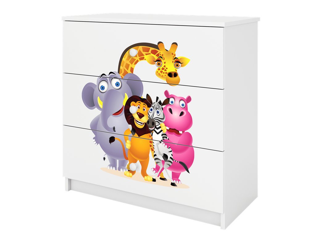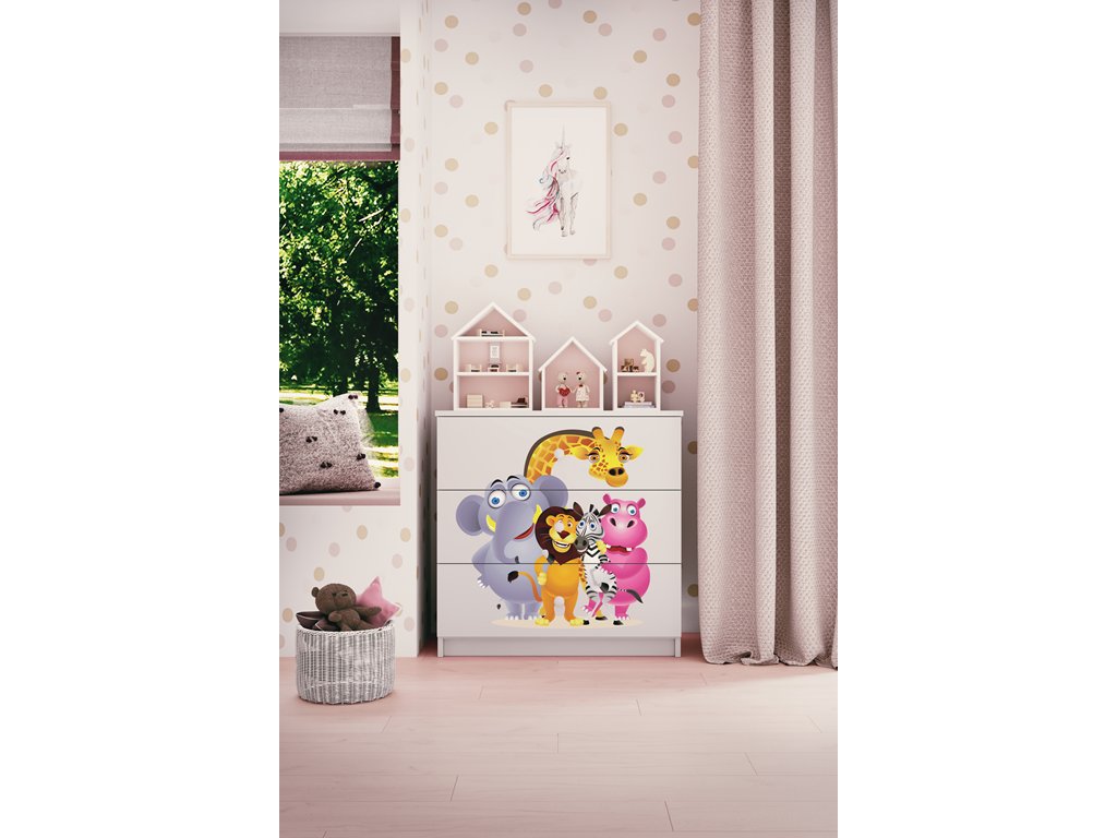 Komoda obsahuje 3 prostorné zásuvky o šířce 69,4 cm a hloubce 33 cm, které jsou uloženy na kuličkových pojezdech. Pro doplnění vzhledu pokrývá přední stranu komody barevný samolepicí obrázek.